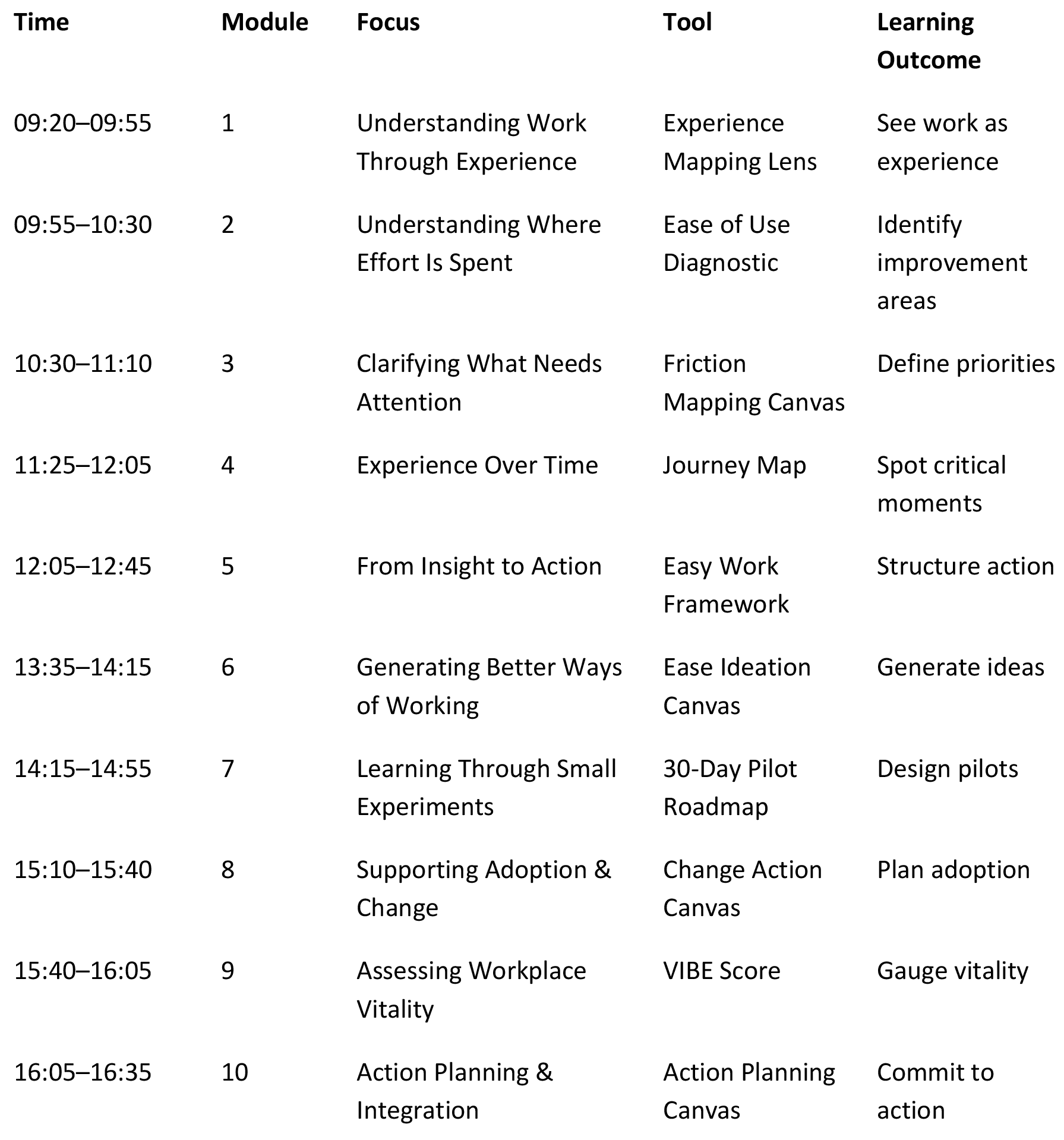 Participants work through ten interconnected modules, each supported by a dedicated tool or canvas.
